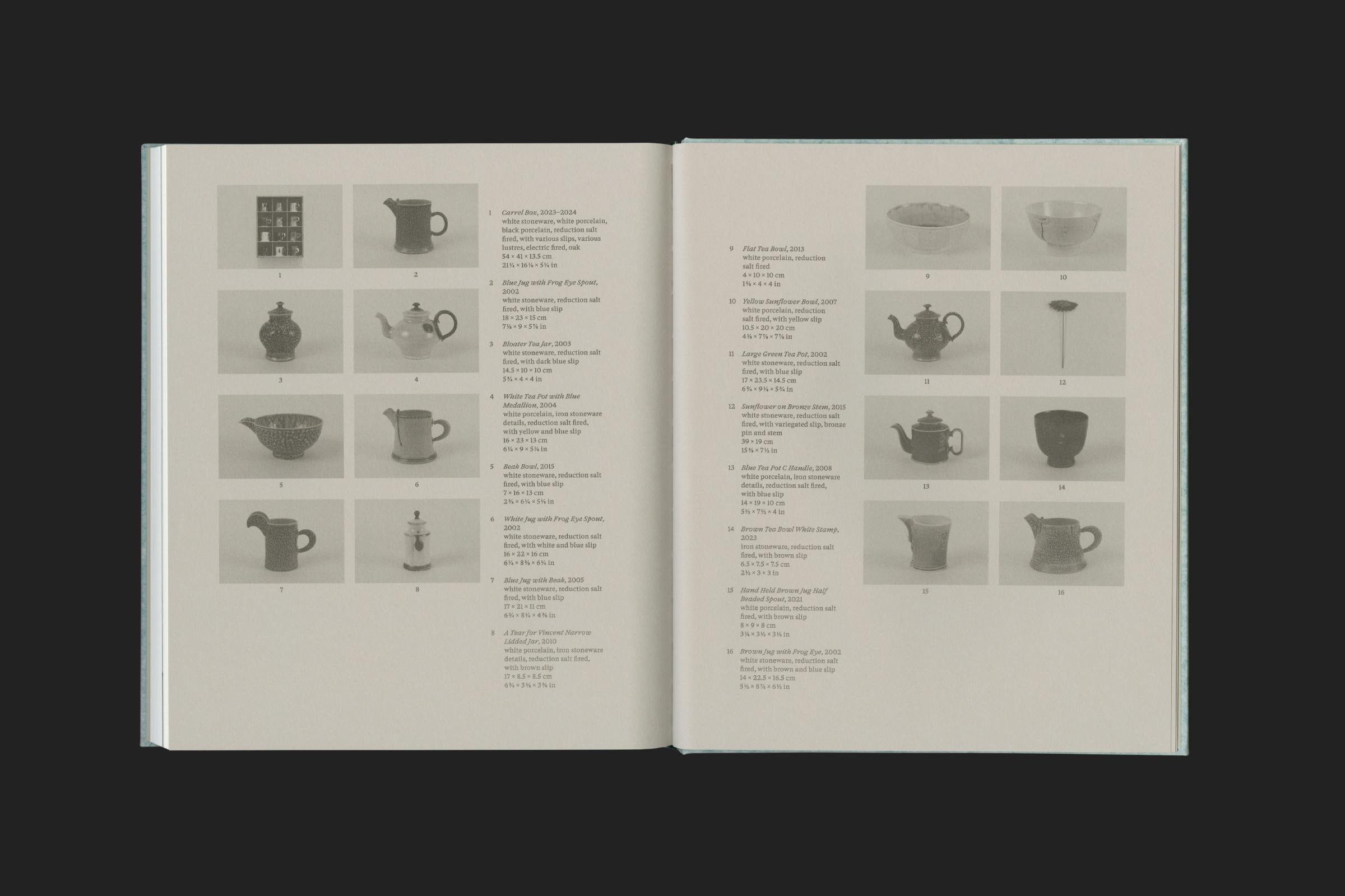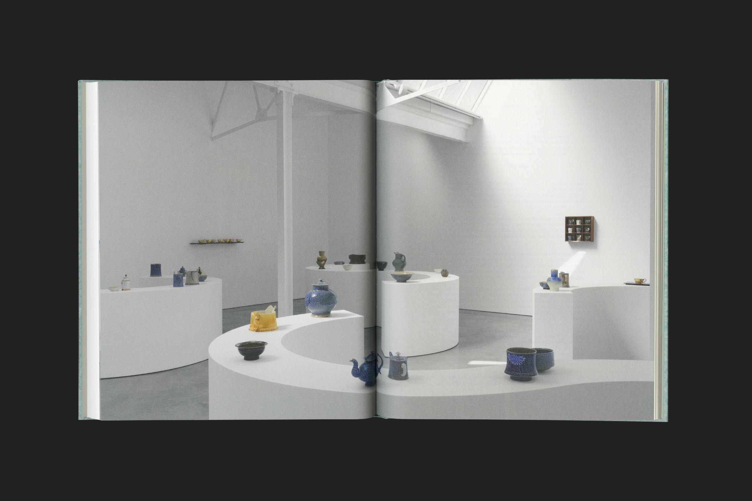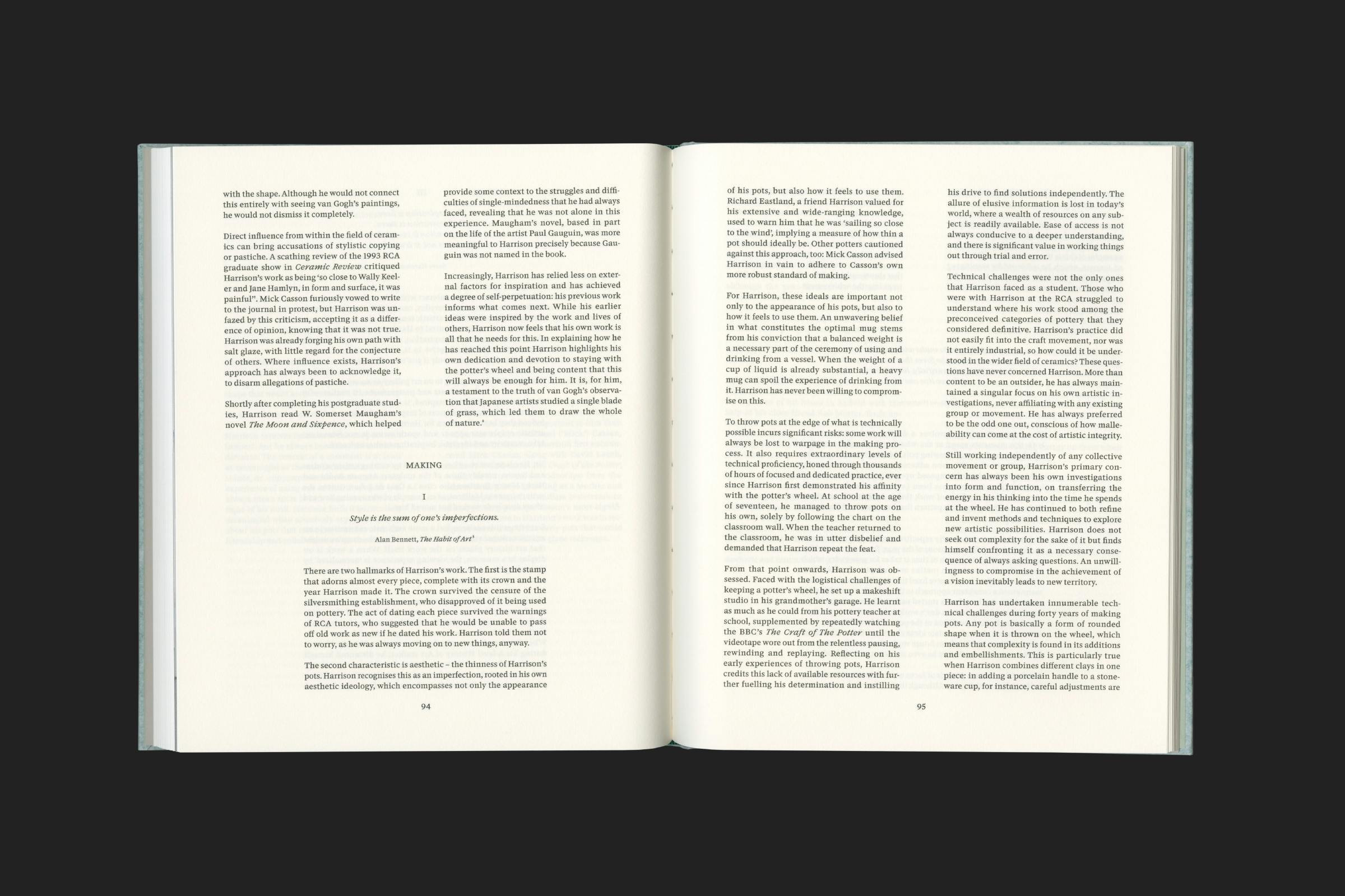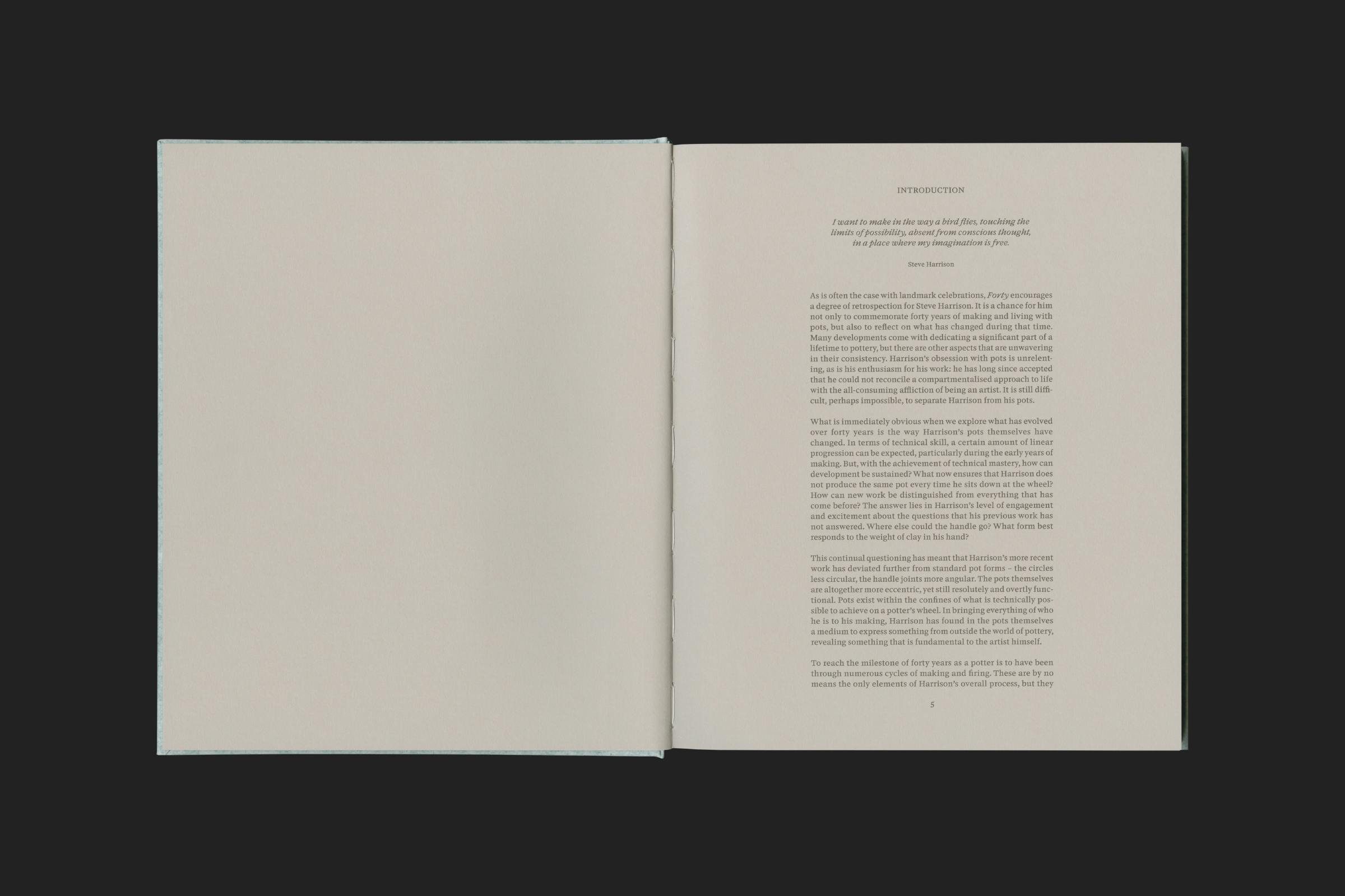 The texture of the cover references Harrison's use of salt glaze, a technique where salt is thrown into a hot kiln, causing it to vaporise and chemically react, leaving a slightly translucent and dappled finish.