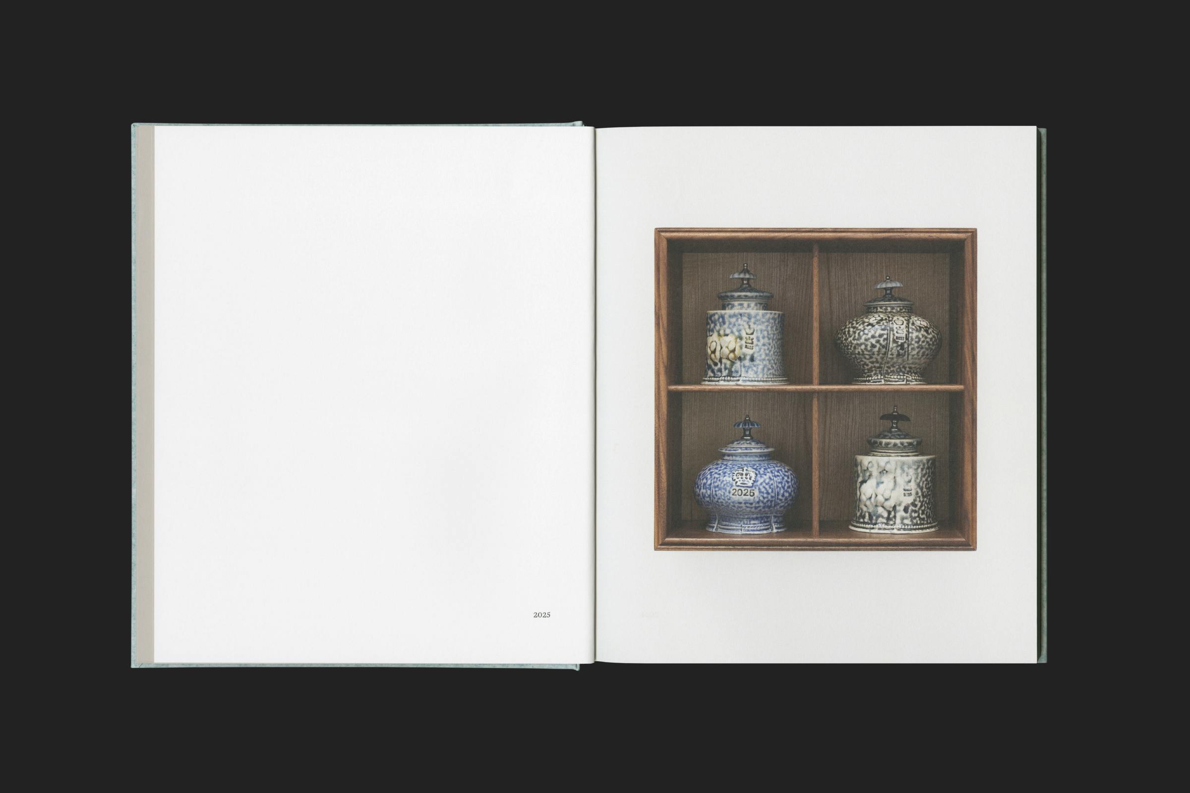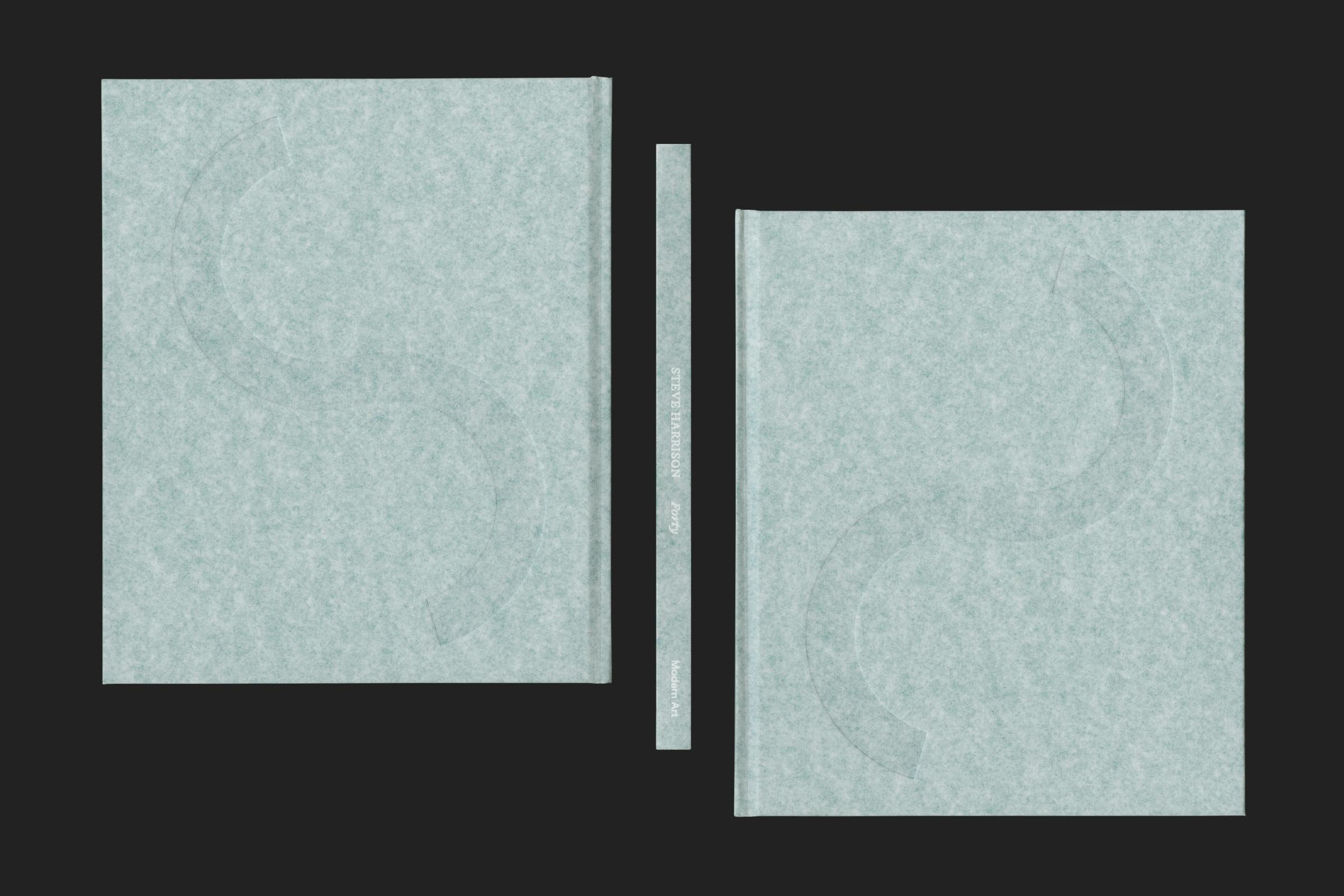 This tactile material has been lightly impressed with white foil text on the spine, and blind debossed a sine-wave form on the front and back covers. This sine-wave shape was also used as the plinth furniture to showcase the works in the exhibition.Â