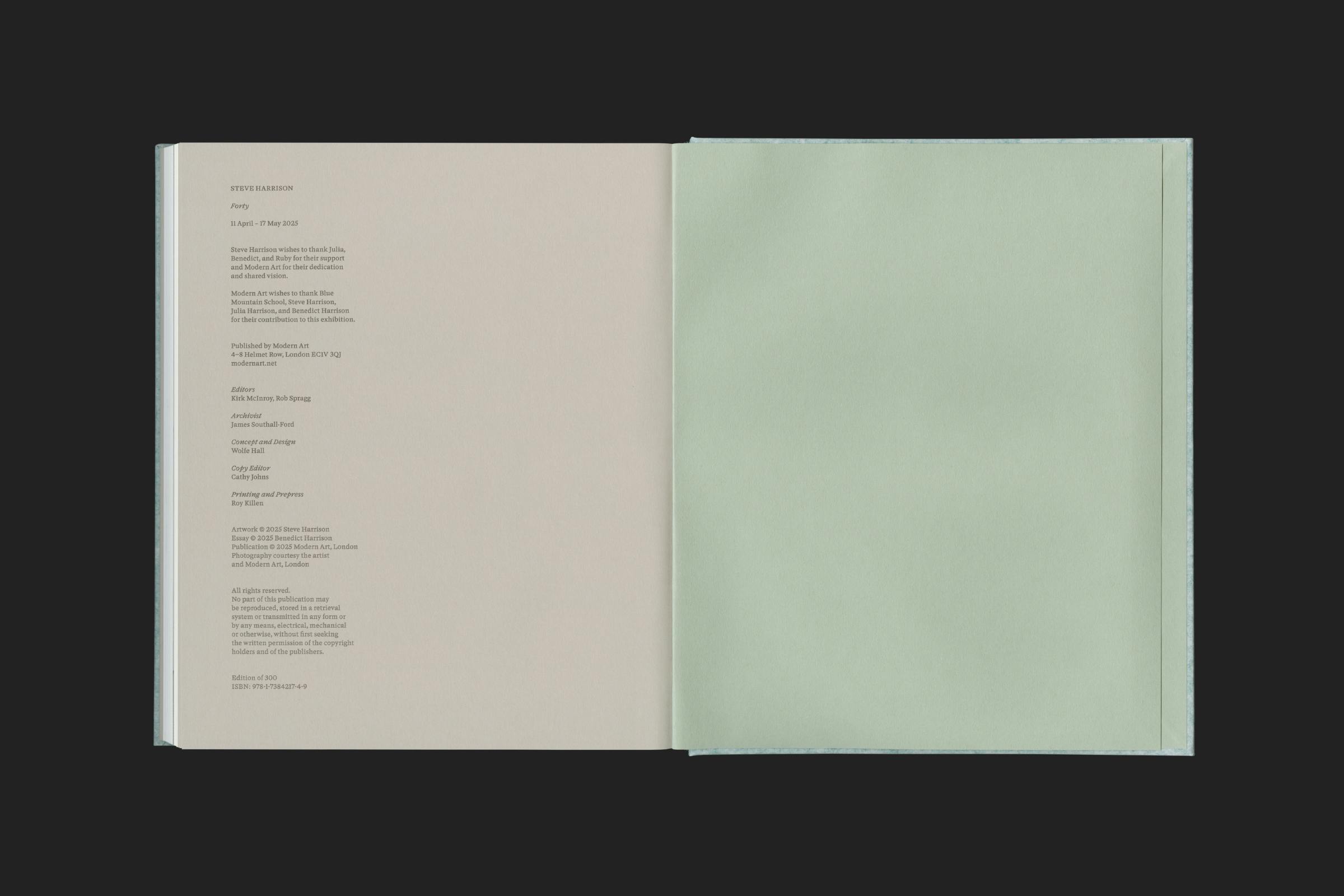 Endpapers tonally shift the cover material from blue to green, and feature an envelope tipped onto the inside back cover containing a loose black and white photograph of the works in situ.Â